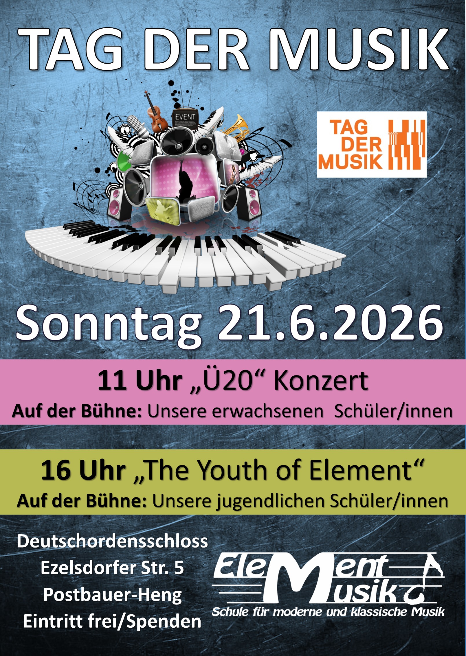 Element Musik bietet Musikinteressierten ein Unterrichts- und Musikkonzept vom Lebensanfang bis ins hohe Alter. Dank flexibler Strukturen kann jeder jederzeit mit dem Musikunterricht beginnen. Dabei legen wir besonderen Wert darauf, dass unsere Schülerinnen und Schüler neben dem Unterricht auch aktiv in Orchestern, Ensembles, Bands oder Chören musizieren können.