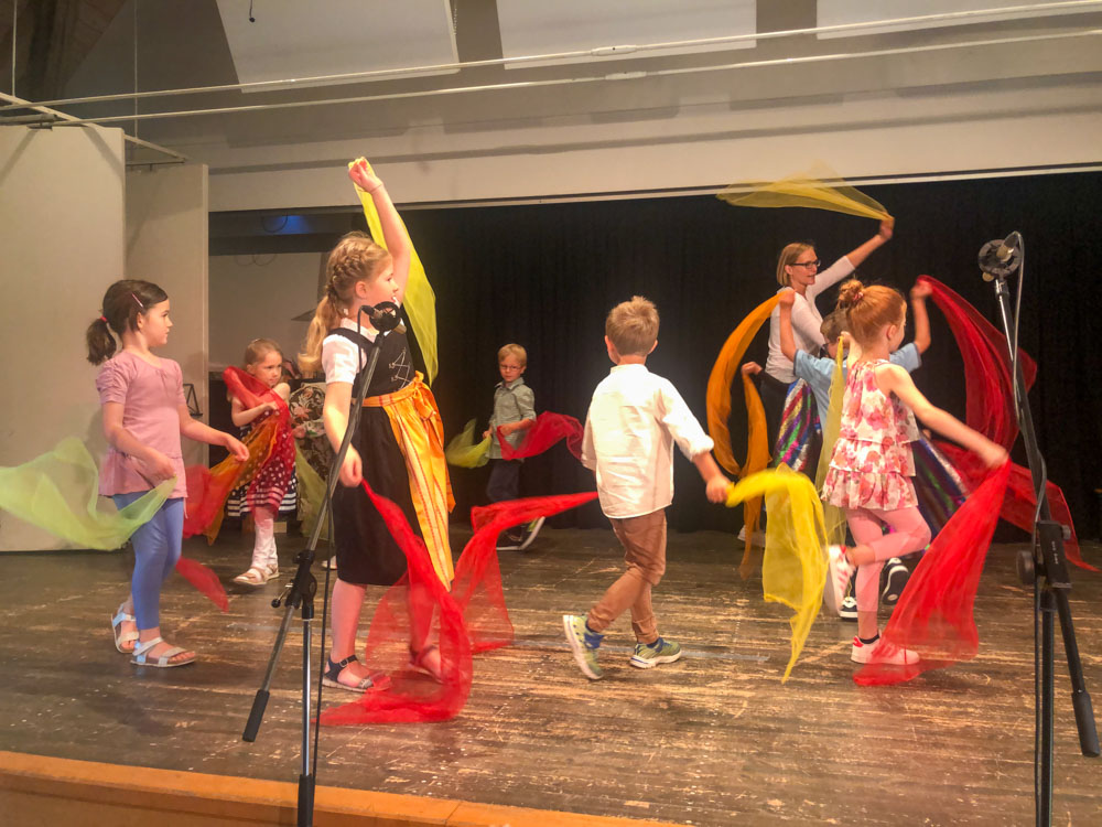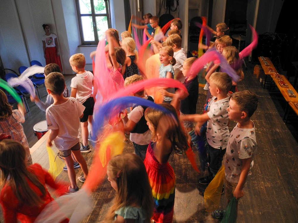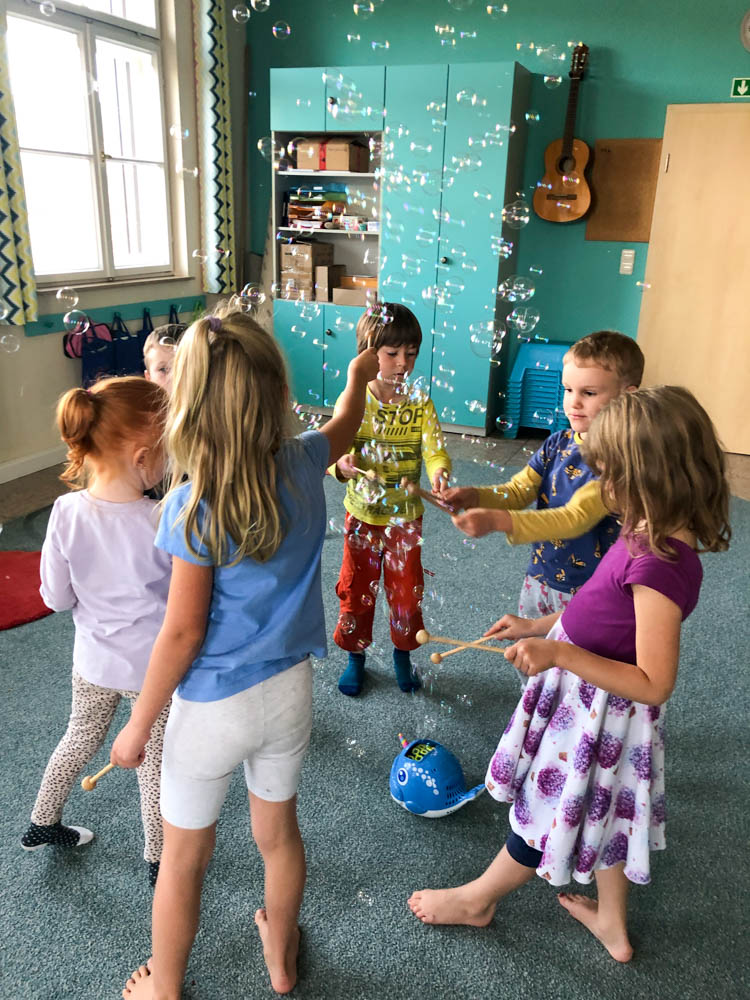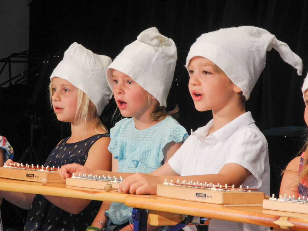 Im Unterricht singen wir, begleiten rhythmisch mit verschiedenen Instrumenten, bewegen uns zur Musik und lernen klassische Stücke kennen. Kreative Materialien helfen bei der Einführung in Instrumentenkunde und Notenlehre.